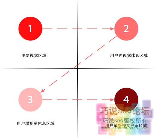 上圖便是古登堡規(guī)律,這都是從眾多數(shù)人那邊的閱讀習(xí)性總結(jié)出來(lái),從上圖可以看出人的主要視覺(jué)區(qū)域是左上角,左下是用戶(hù)視覺(jué)最弱的區(qū)域。右上呢是用戶(hù)視覺(jué)休息區(qū)域,右下是用戶(hù)最終視覺(jué)停留區(qū)域。根據(jù)古登堡圖我們應(yīng)該在最好的兩個(gè)區(qū)域做好一些高價(jià)值創(chuàng)意的內(nèi)容來(lái)吸引用戶(hù)眼球,來(lái)拴住用戶(hù)的心。