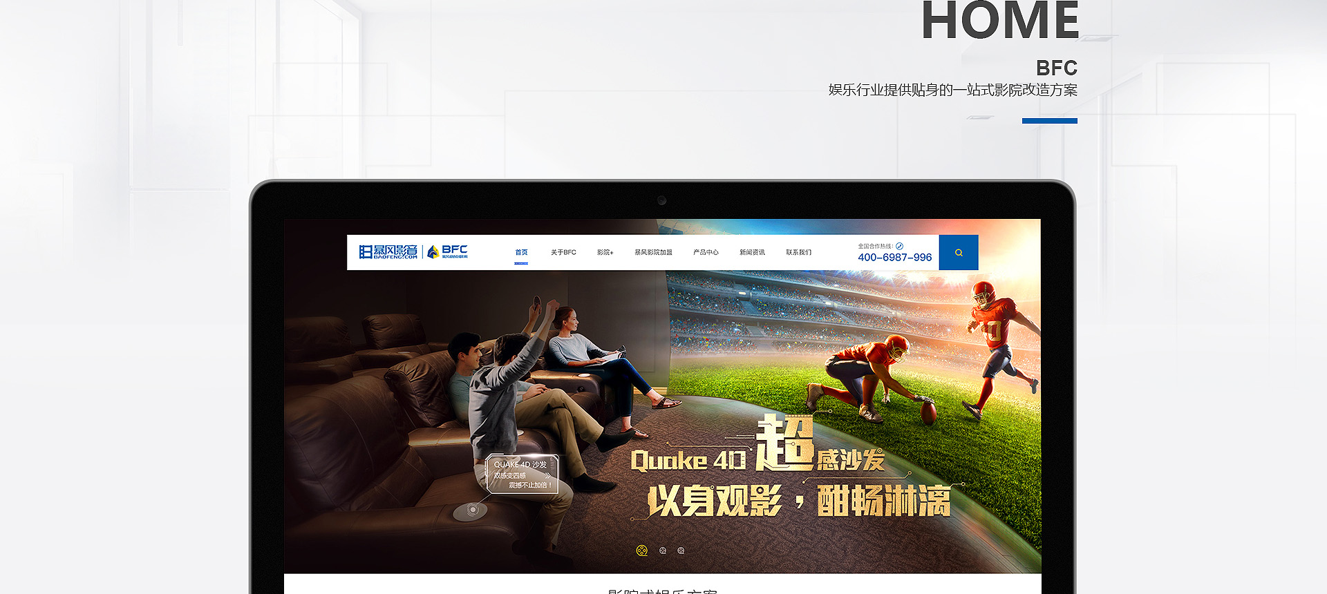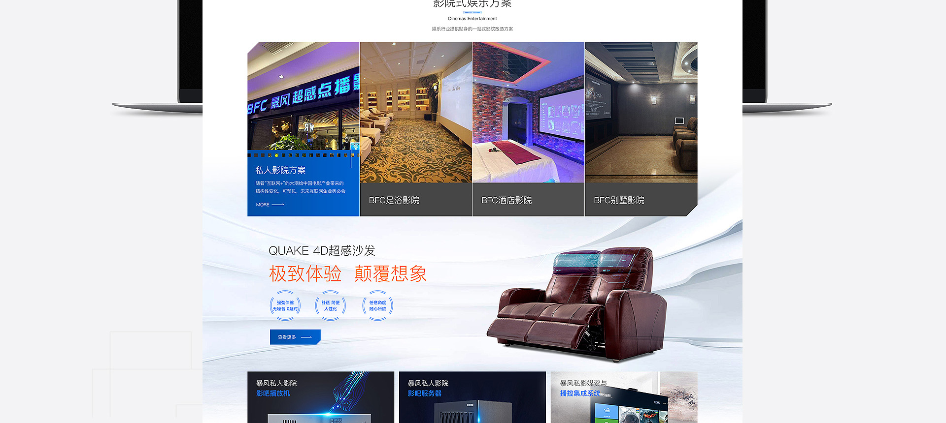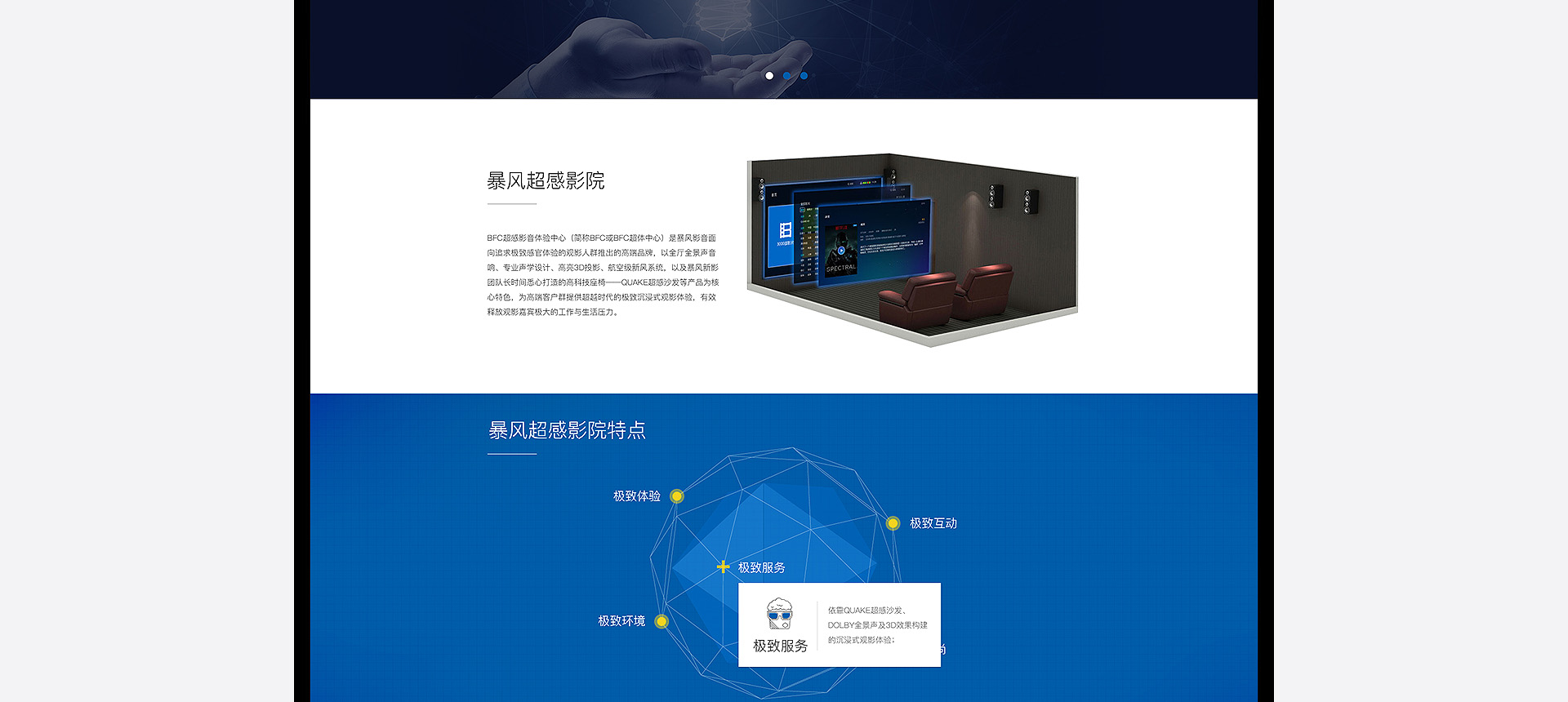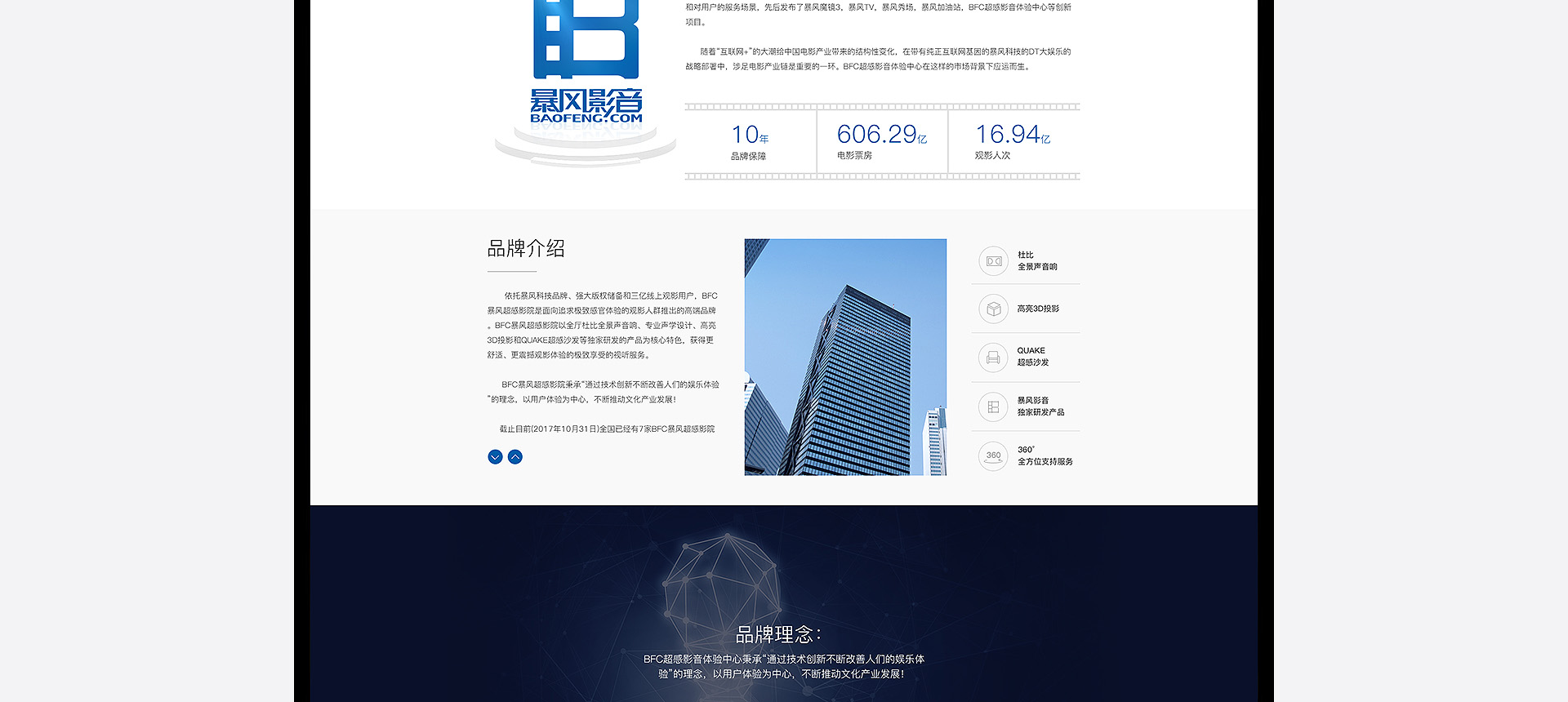 依托暴風科技品牌、強大版權儲備和三億線上觀影用戶,BFC暴風超感影院是面向追求極致感官體驗的觀影人群推出的高端品牌。BFC暴風超感影院以全廳杜比全景聲音響、專業聲學設計、高亮3D投影和QUAKE超感沙發等獨家研發的產品為核心特色,獲得更舒適、更震撼觀影體驗的極致享受的視聽服務。 BFC暴風超感影院秉承“通過...