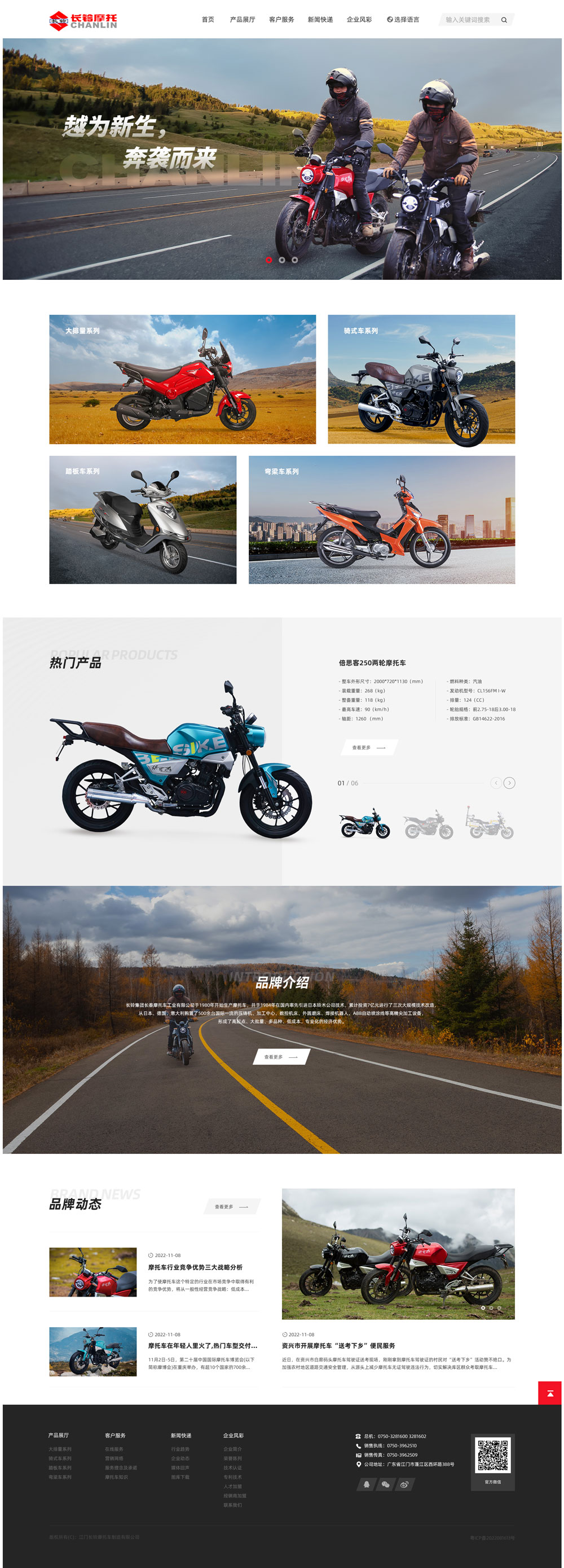 公司現已形成年產50萬輛摩托車的生產能力。并先后于1995年、1998年通過了ISO9001和ISO9002國際質量體系認證,于2003年通過了3C認證和國家摩托車準入,2005年通過歐II認證,整車和發動機在國家權威部門抽檢中多次獲得“優等品”稱號。2010年,長鈴品牌(長鈴/CHANLIN)被評為中國馳名商標,產品暢銷國內全部的省、市、自治區,并出口到歐洲、中東、南美、非洲、東南亞等國家和地區。