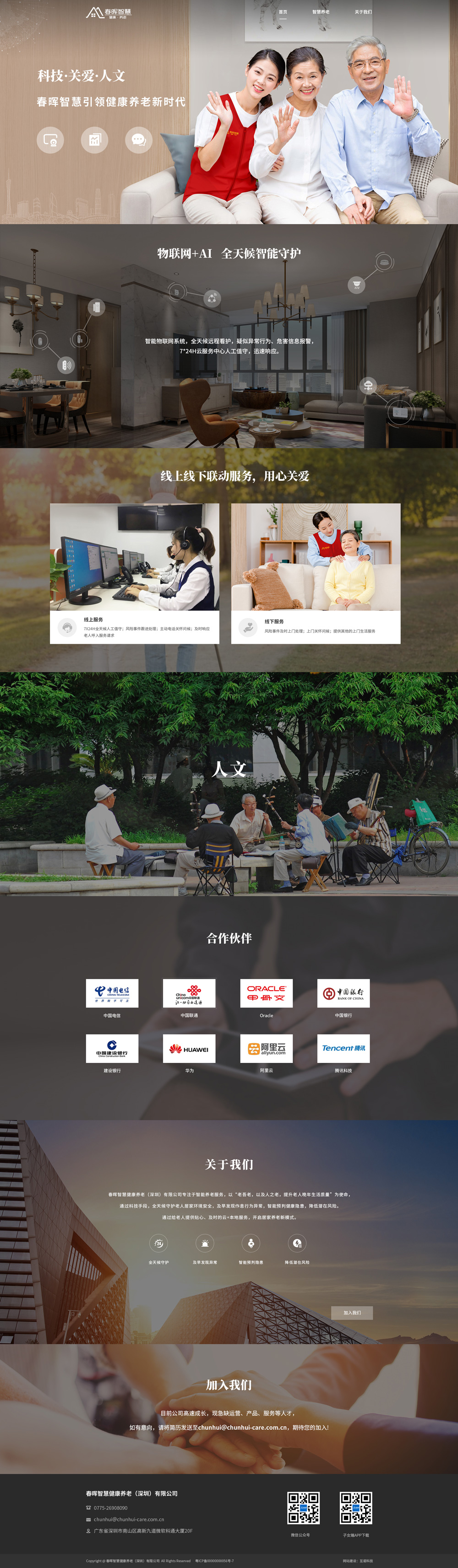 春暉智慧健康養(yǎng)老(深圳)有限公司專注于智能養(yǎng)老服務,以“老吾老,以及人之老,提升老人晚年生活質量”為使命, 通過科技手段,全天候守護老人居家環(huán)境安全,及早發(fā)現(xiàn)作息行為異常,智能預判健康隱患,降低潛在風險。 通過給老人提供貼心、及時的云+本地服務,開啟居家養(yǎng)老新模式。