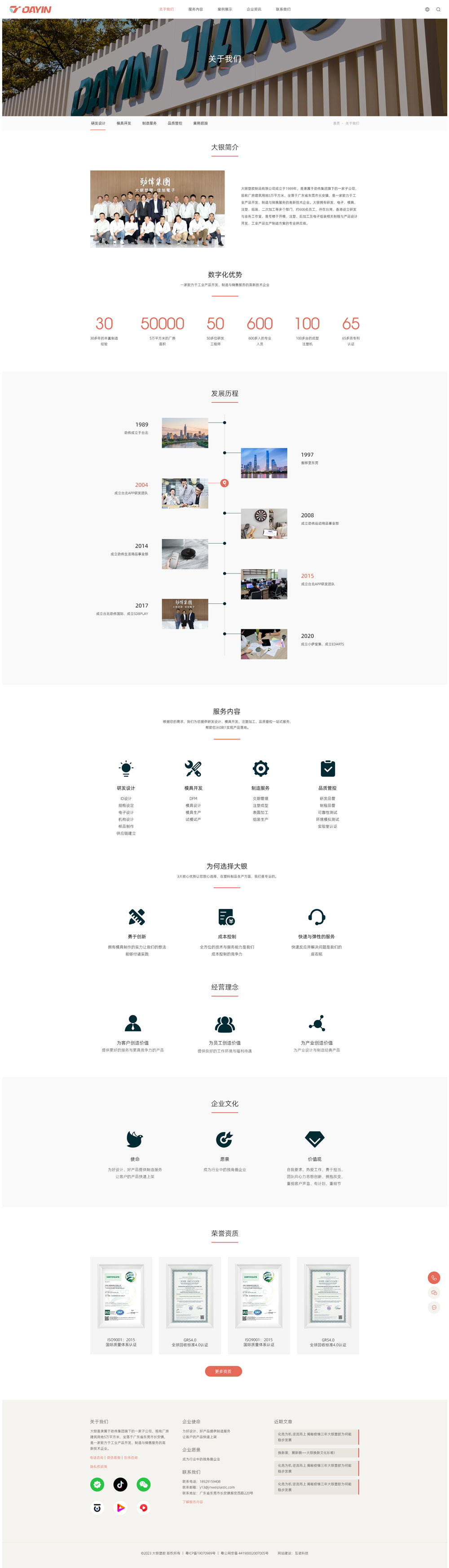 大銀塑膠制品有限公司是專注家電模具制造,提供OEM/ODM代工服務。公司成立于1989年,是一家集研發、制造服務于一體的制造方案供應商。專精于開模、注塑、后加工及電子組裝等相關制程。除代工服務外并研發自有產品可供客戶直接貼牌定制生產,自有產品分別為掃地機器人、塑膠餐具及電子飛鏢靶。 總部于東莞長安,我們擁有50000平方米的生產基地,30年模具開發經驗,50多位研發人員,100多臺注塑機,并不斷開發新材料、新工藝與產品設計等創新項目。致力于為客戶提供高品質的制造服務,節約成本,幫助客戶產品快速上架,為客戶創造價值。