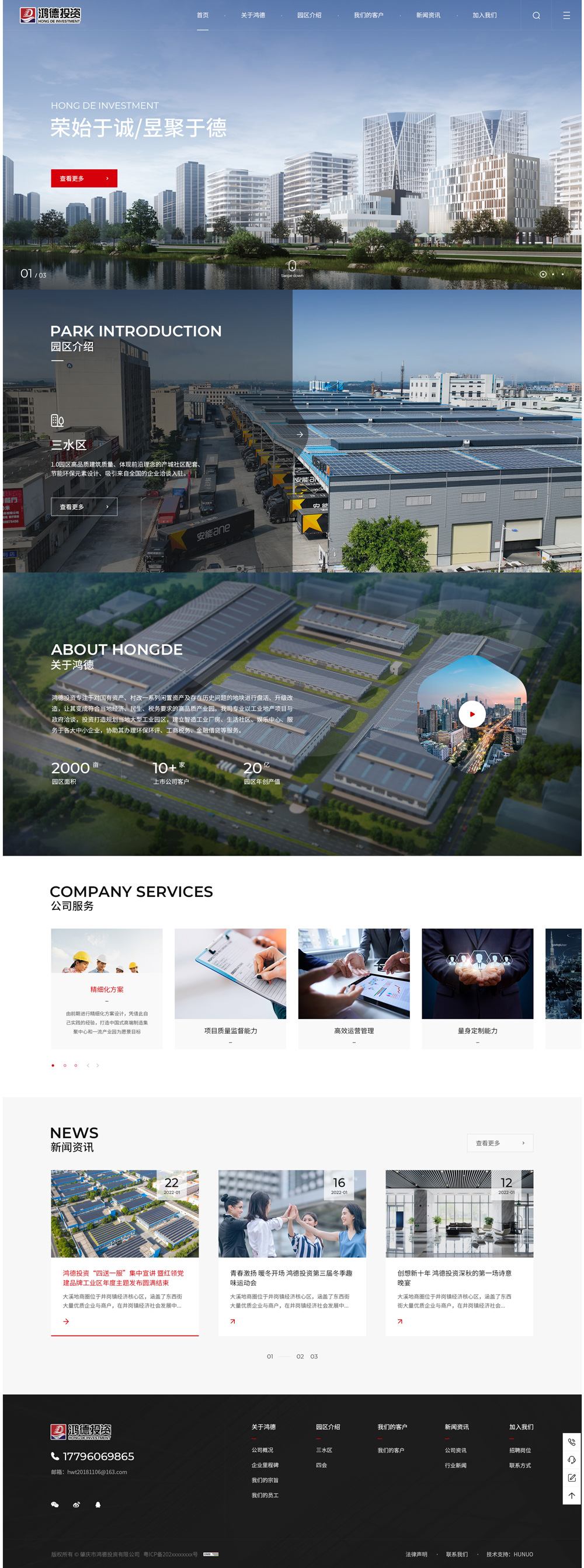 鴻德投資有限公司(簡稱“鴻德”)。主要業務范圍:產業定位規劃、園區代理招商、園區托管運營、工業園區互聯網應用。致力于對國有資產、村改一系列閑置資產及存在歷史問題的地塊進行盤活、升級改造,讓其變成符合當地經濟、民生、稅務要求的高品質產業園;為企業、工業園提供產業研究咨詢、工業地產開發可行性規劃、商業計劃書、產業布局、空間規劃、園區招商代理、園區落地運營、產業資本設計、產業數據平臺搭建解決方案。