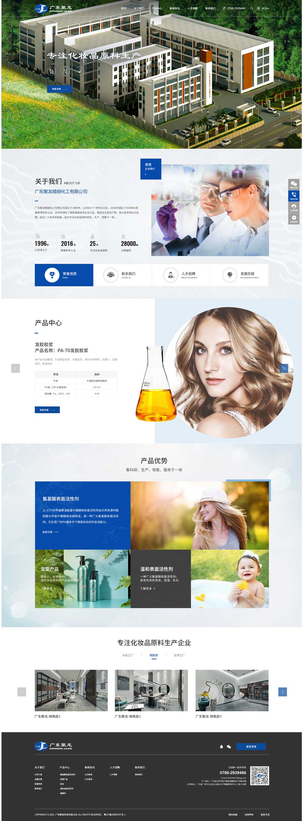 廣東聚龍精細化工有限公司成立于1996年,公司位于廣州市白云區,建筑面積20000平方米。2016年通過了ISO9001質量管理體系認證,2018年通過了國家高新技術企業認定,擁有自主知識產權、核心技術和自主品牌。經過二十多年的發展,成為專注化妝品原料研發、生產、銷售于一體,擁有自動化生產設備及完善的現代檢測手段的高新技術企業。