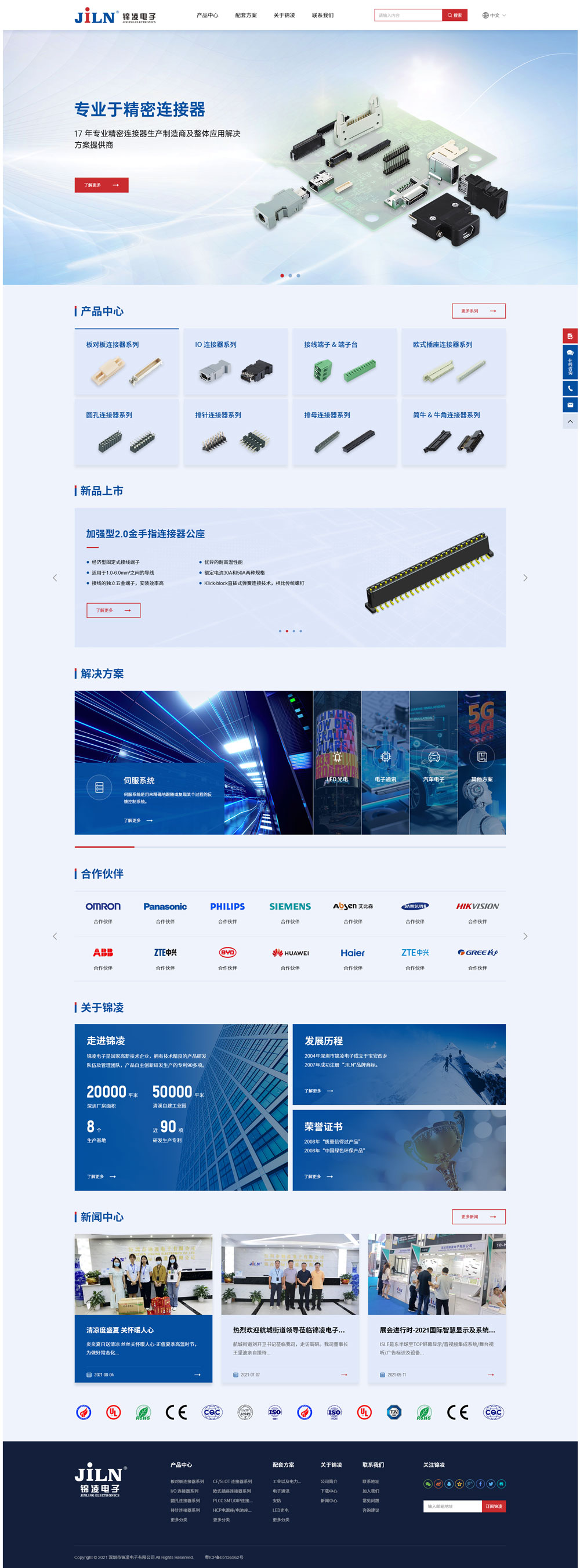 錦凌電子己通過:IATF16949及ISO9001-2015質量管理體系認證,ISO14001-2015環境管理體系認證,連接器產品,線材產品己通過美國UL安規認證,認證號:E362810、E472355,端子臺認證號:E484895及TUV產品認證,CE認證。產品主要包括:排針排母、圓孔排針排母、端子臺、扁平排線、FFC軟排線、電子線束、伺服線束、簡牛牛角、電源座、SATA、SCSI、DIN41612、PLCC、IDC、小間距BTB、浮動式板對板、金手指、歐式插座、卡座等系列產品;產品規格60000多種。產品廣泛應用于工業及 電力控制、5G通訊、安防、LED光電、 液晶顯示、變頻器、工業自動化、伺服控制 、PLC,工業互聯網、醫療儀器、汽車電子、電腦主板、打印機、電子玩具、各類消費類電子、電器等諸多領域。