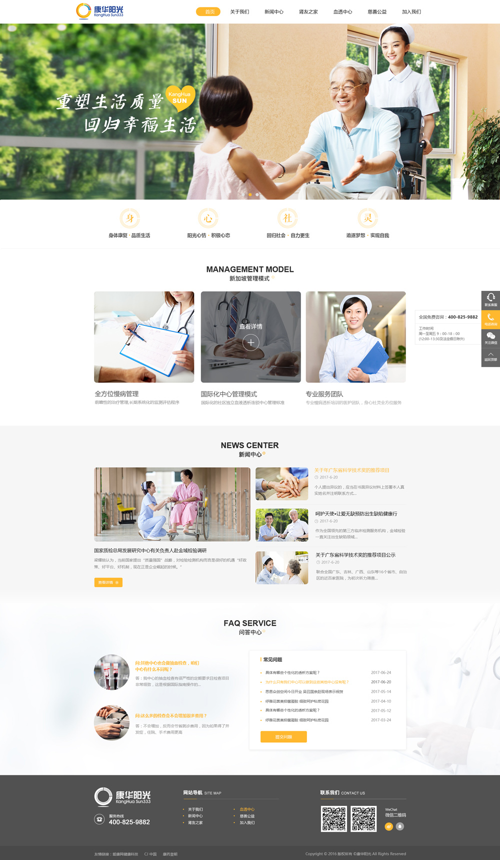 康華陽光擁有卓越的管理團隊,高效的業務團隊和專業、國際化的醫療團隊,是業內罕見兼具綜合實力和實戰經驗的獨立血液透析機構。康華陽光初始核心團隊于2008年進駐中國,首次將國外“大型連鎖獨立透析機構”的概念引進中國,截至2016年,康華陽光團隊已為血透事業積蓄了8年的力量,在全國各地建立了二十余家獨立血透中心,實現了新加坡管理模式和國際標準在國內的成功落地,為500多名腎友提供了媲美日本、臺灣及歐美發達國家和地區的臨床成效,幫助許多腎友回歸了正常生活。