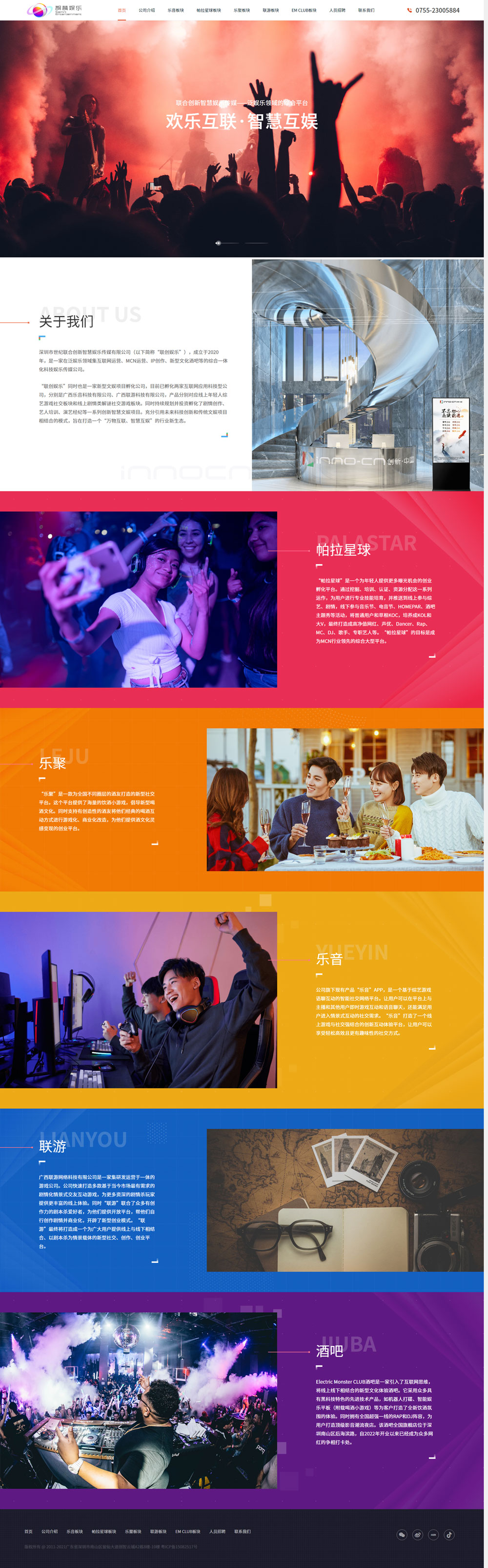 深圳市世紀聯合創新智慧娛樂傳媒有限公司(以下簡稱“聯創娛樂”),成立于2020年,是一家在泛娛樂領域集互聯網運營、MCN運營、IP創作、新型文化酒吧等的綜合一體化科技娛樂傳媒公司。