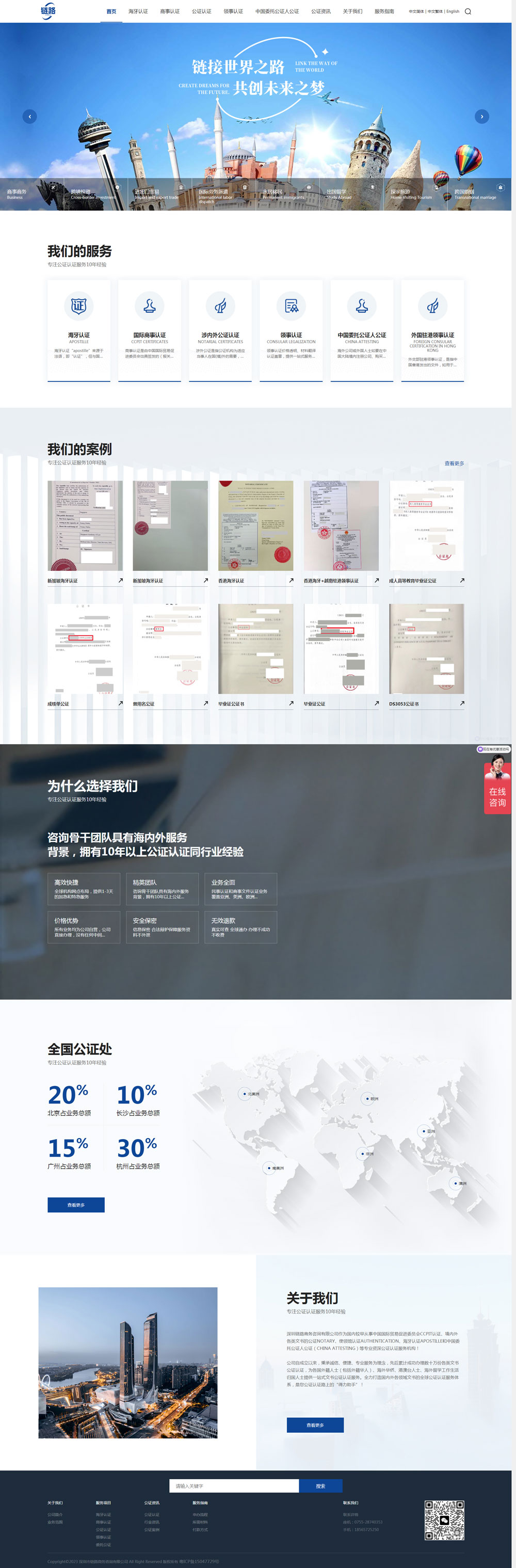 深圳鏈路商務咨詢有限公司作為國內較早從事中國國際貿易促進委員會CCPIT認證、境內外各類文書的公證Notary、使領館認證Authentication、海牙認證Apostille和中國委托公證人公證(China ;Attesting)等專業資深公證認證服務機構!公司自成立以來,秉承誠信、便捷、專業服務為理念,先后累計成功辦理數十萬份各類文書公證認證,為各國外籍人士(包括外籍華人)、海外華僑、港澳臺人士、海外留學工作生活歸國人士提供一站式文書公證認證服務。全力打造國內外各領域文書的全球公證認證服務體系,是您公證認證路上的“得力助手”!
