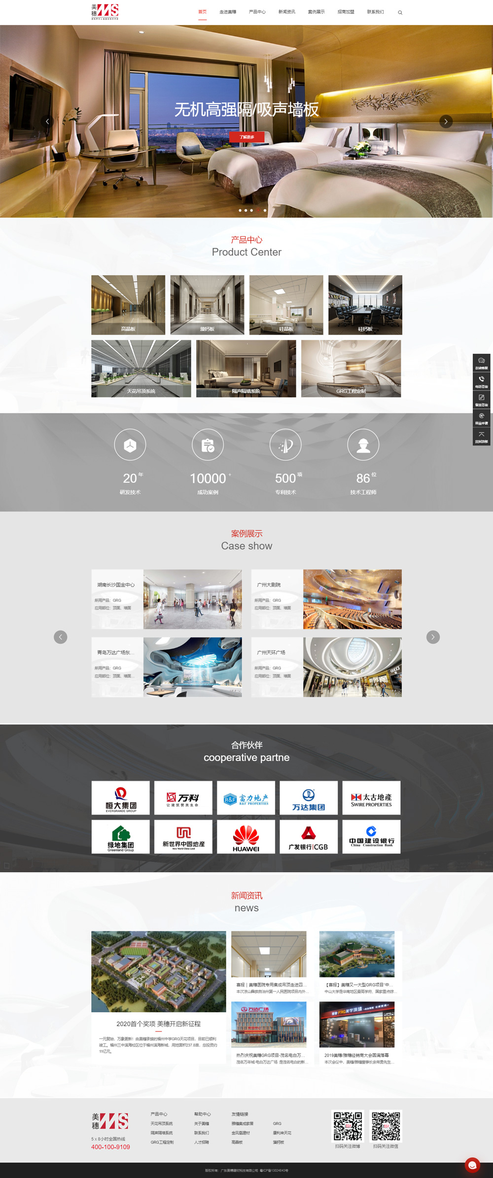 公司的產品不僅具有高強輕質、A1級防火、綠色環保、節能低碳、抗菌耐腐、防霉防潮防蟲蛀、濕暖保溫等良好的物理性能,而且擁有隔聲/吸聲/擴散/反射等優良的聲學性能,同時造型豐富任意、可鏤空/浮雕、可平面/單曲二維/雙曲三維等立體構造,且安裝方式方便快捷,裝飾效果渾圓大氣、靚麗高雅!先后成功承接了華為總部大樓、廣州電視塔/太古匯/大劇院、深圳平安金融中心/大運會主場館、香港大學深圳醫院、北京鳳凰衛視媒體中心、天津干細胞、杭州EFC國際金融中心、青島萬達東方影都、成都第五人民醫院等一大批榮獲全國建筑工程魯班獎、建筑裝飾工程獎的大型地標項目和經典工程。