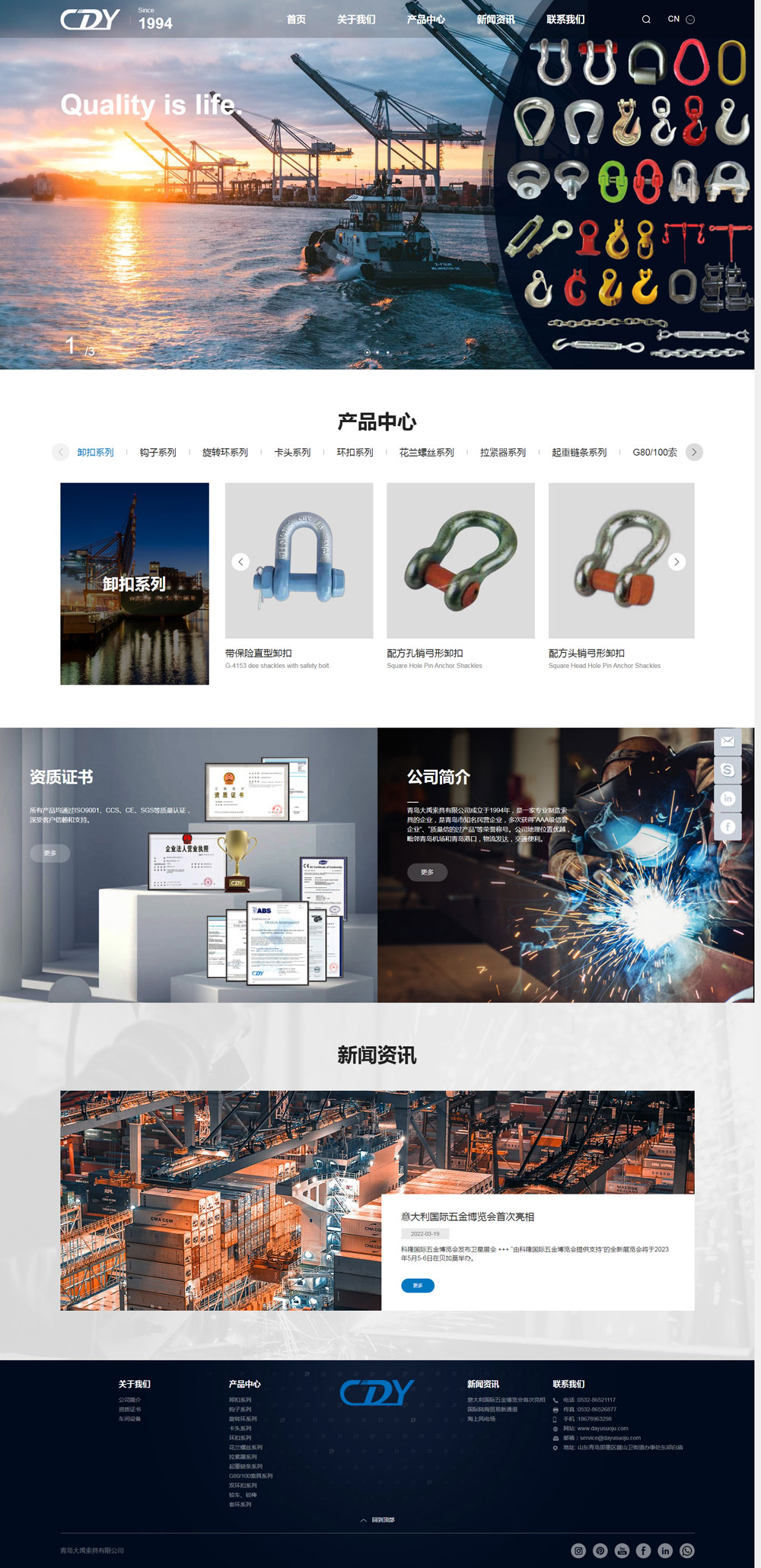 青島大禹索具有限公司成立于1994年(即墨市大禹索具廠),是一家專業制造索具的企業,是青島市知名民營企業,多次獲得“AAA級信譽企業”、“質量信得過產品”等榮譽稱號。公司地理位置優越,毗鄰青島機場和青島港口,物流發達,交通便利。 廠區規模近萬平米,產品銷往100多個國家和地區。