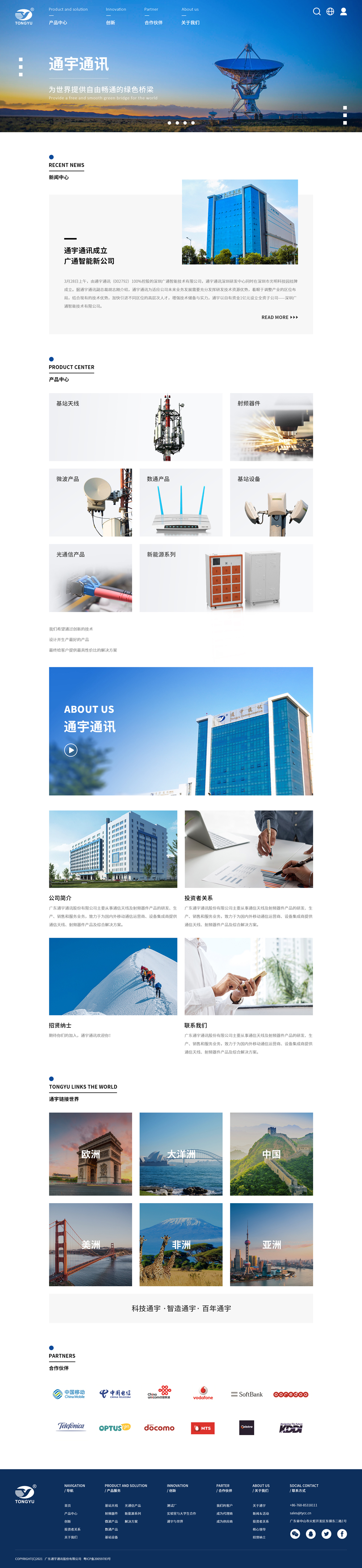 廣東通宇通訊股份有限公司(簡稱:通宇通訊,股票代碼:002792)創立于1996年,地處粵港澳大灣區中心地帶——廣東省中山市火炬高技術產業開發區。主要從事移動通信基站天線、微波天線、射頻器件、光模塊、無線寬帶終端、小基站和專網設備等產品的研發、生產、銷售和服務業務,致力于為國內外移動通信運營商、設備集成商提供通信天線、射頻器件產品及綜合解決方案。通宇通訊目前已有3個生產基地(中山、武漢、印度)、4個海外分公司(香港、澳大利亞、芬蘭、印度)及3個全資子公司(中山市通宇通信技術、深圳光為、廣通智能)。具備強大的全球生產、供貨能力。通宇通訊基站天線已大量應用于全球各地,截至目前,已超過5,000,000面在網應用。是華為、中興、諾基亞、愛立信、大唐等系統設備商認證的全球供應商,并獲得中國移動、中國電信、中國聯通和Vodafone、Telefonica、Telstra、MTS、TPG、Telstra、Optus、Rogers、Veon等眾多運營商的認證。