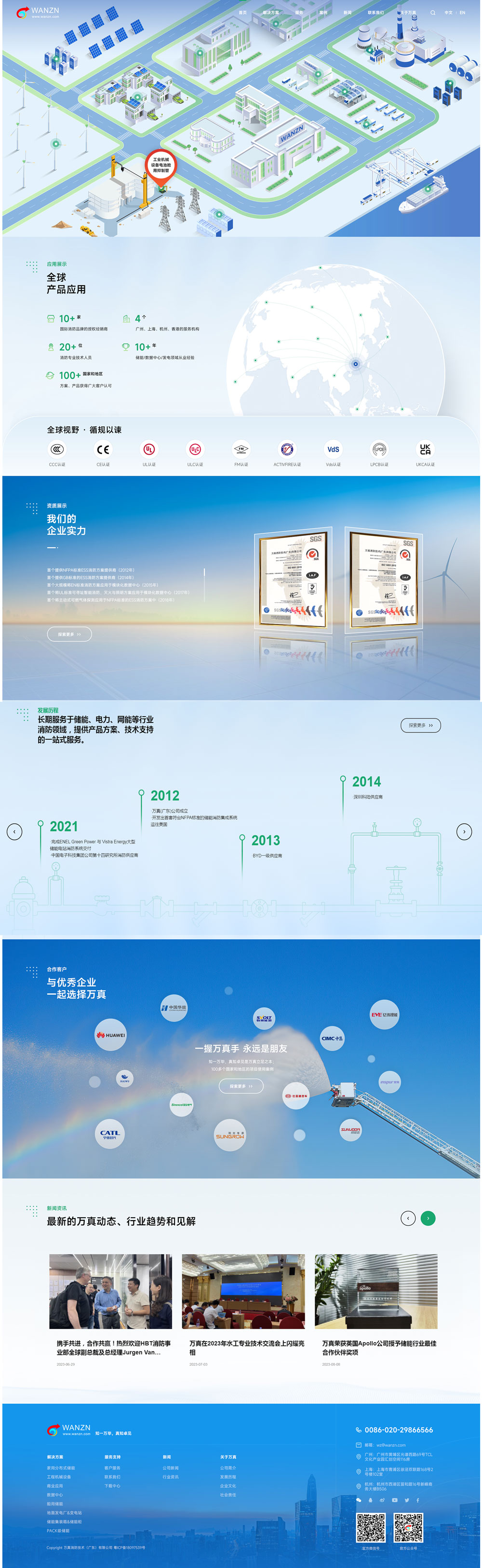WANZN發源于廣州,專業提供消防解決方案,與模塊化移動設備、電廠、商業建筑、能源企業消防解決方案十年有余,2018年開始,為助力國內外新能源企業急速發展的安全需求,開辟出專注服務能源安全的業務板塊,提供能源安全系統性技術解決方案,成為中國最早提供符合NFPA標準的儲能消防系統的供應商,并完成AHJ審核交付,是一家集發、設計、提供技術支持和售后落地服務的專業的消防安全企業。