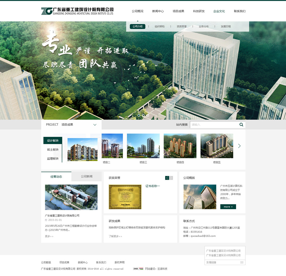 通過多年的努力,我院形成了以廣州為中心,以廣東地區為重心,輻射全國的經營格局。項目遍及湖南、湖北、海南、江蘇、陜西、內蒙古等13個省市自治區40多個城市。多項由我院承擔設計、勘察、監理的項目獲國家和省部級獎 項,其中國家級獎項10項,省部級獎項100多項。此外,我院連續十七年被省工商局評為“守合同重信用單位”,被國家工商行政管理總局評為2010~2011、2012~2013年度“守合同重信用”企業。