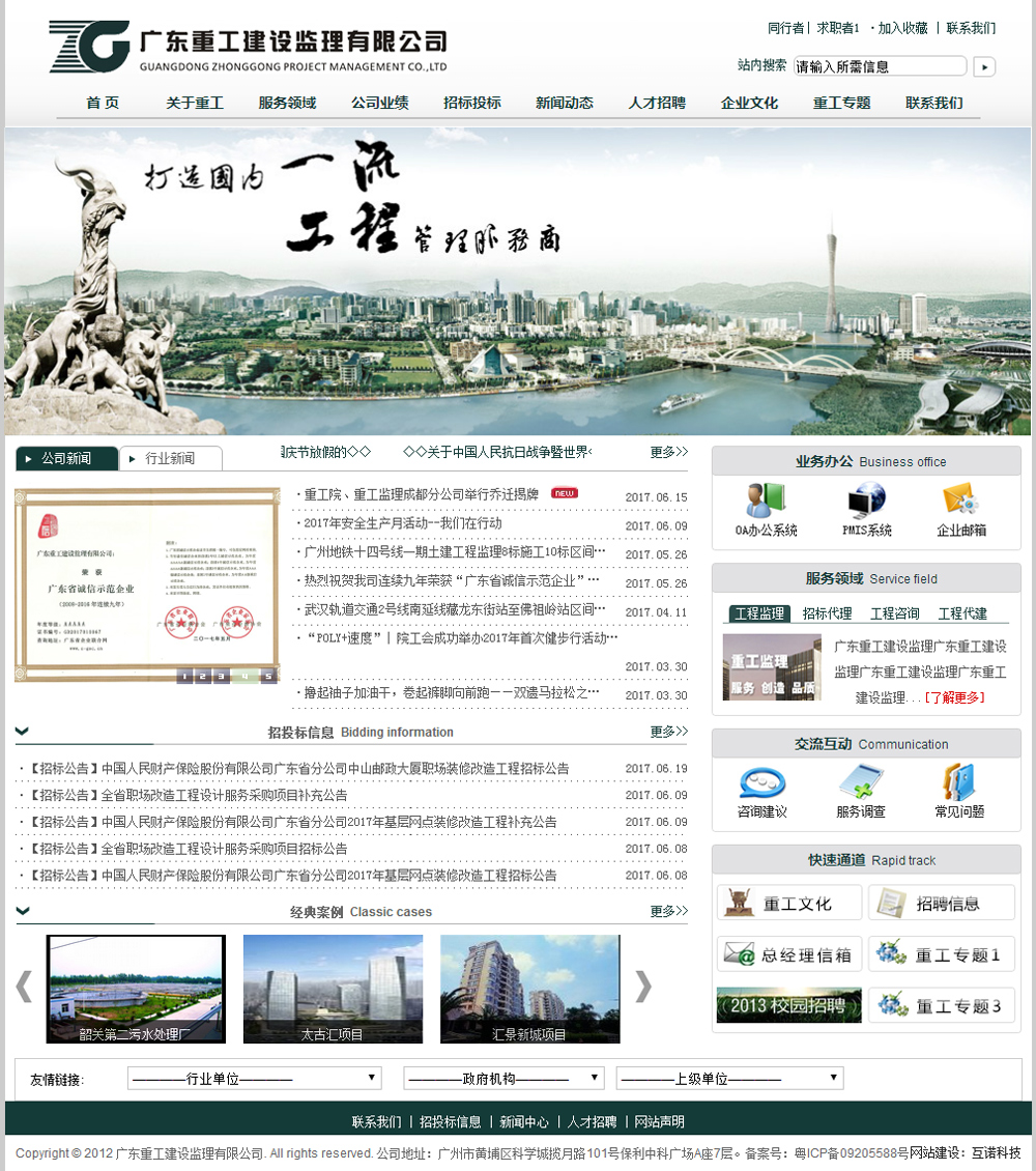 公司自成立以來,重工人艱苦奮斗、銳意進取、以質(zhì)量求效益、以信譽求發(fā)展,創(chuàng)造了一個又一個工程奇跡,獲得一個又一個的嘉獎證書。到目前為止,本公司承接的監(jiān)理項目四百多項,總建筑面積七百多萬平方米,總造價三百多億元。其中,在近五年的獲獎項目中,屬于國家級的獎項有興豐生活垃圾衛(wèi)生填埋場工程獲國家優(yōu)質(zhì)工程金質(zhì)獎,凱旋新世界L4區(qū)工程獲國家優(yōu)質(zhì)工程銀質(zhì)獎,中海藍灣工程獲詹天佑大獎優(yōu)秀住宅小區(qū)金獎等,屬于廣東省、廣州市級別的獲獎項目多達數(shù)十項。
