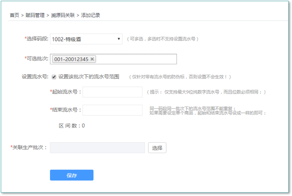 第七步:溯源碼與生產批次關聯(產品生產中都是用批次記錄信息的,最終需要將溯源碼和批次關聯)
