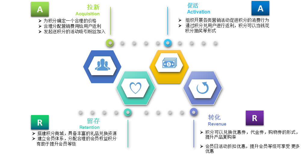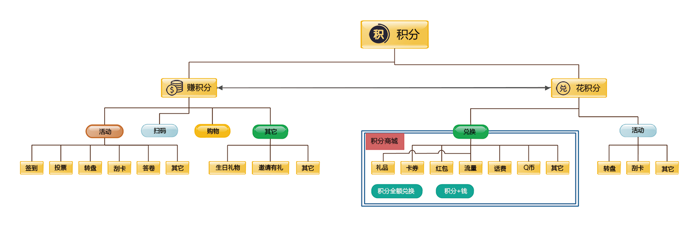 | 途徑廣,簽到、投票、掃碼、購物、推廣等 | 積分賺取途徑 | 較單一 |