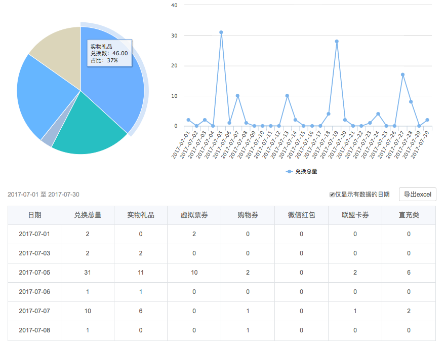 自主查詢指定時段內用戶的積分成交單數、成功兌換禮品數(及各類型禮品量)、消耗積分數、消耗金額數、最熱門的禮品等。