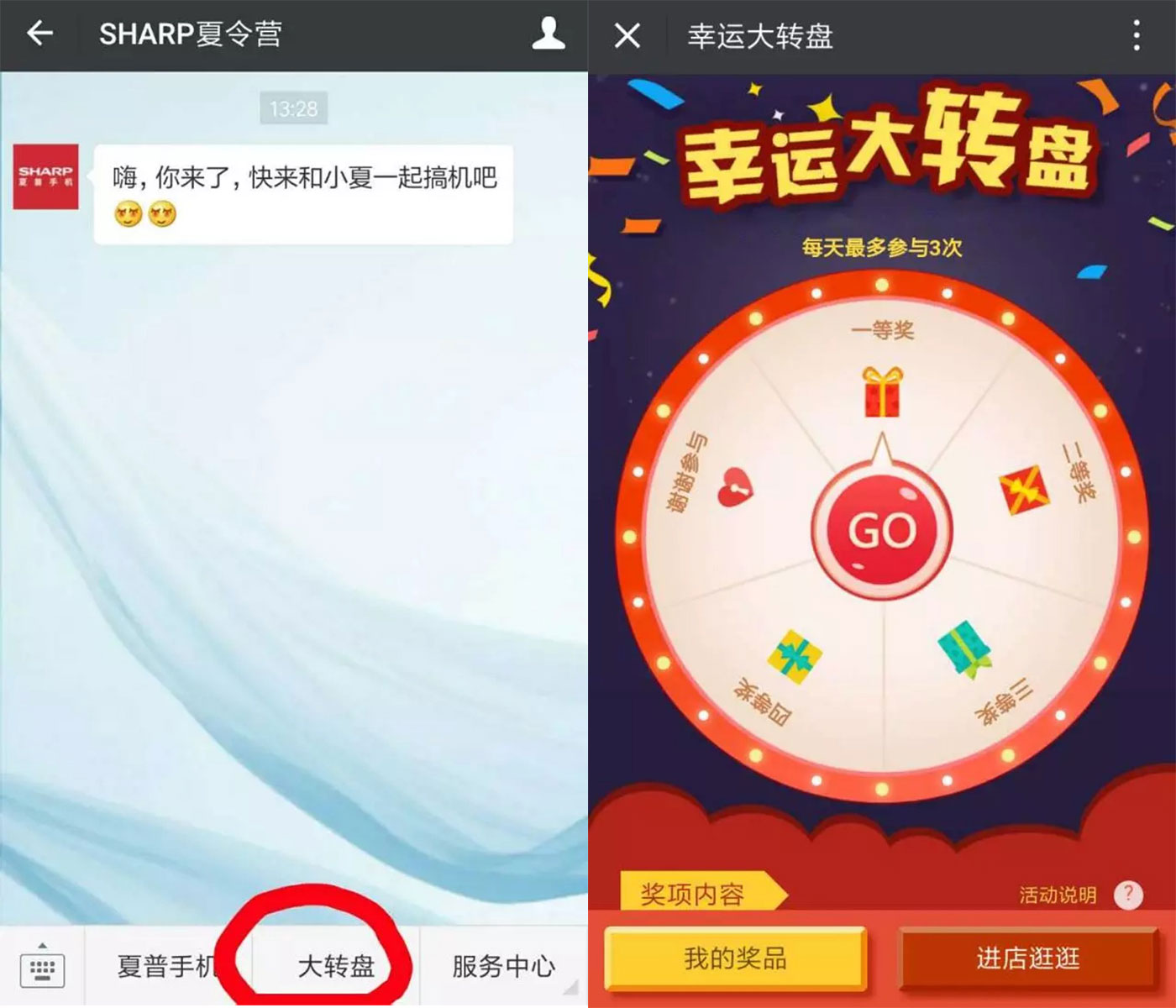 大轉盤抽獎——提升用戶的互動參與感,有機會獲紅包、產品、積分或購物券,促進用戶活躍度。