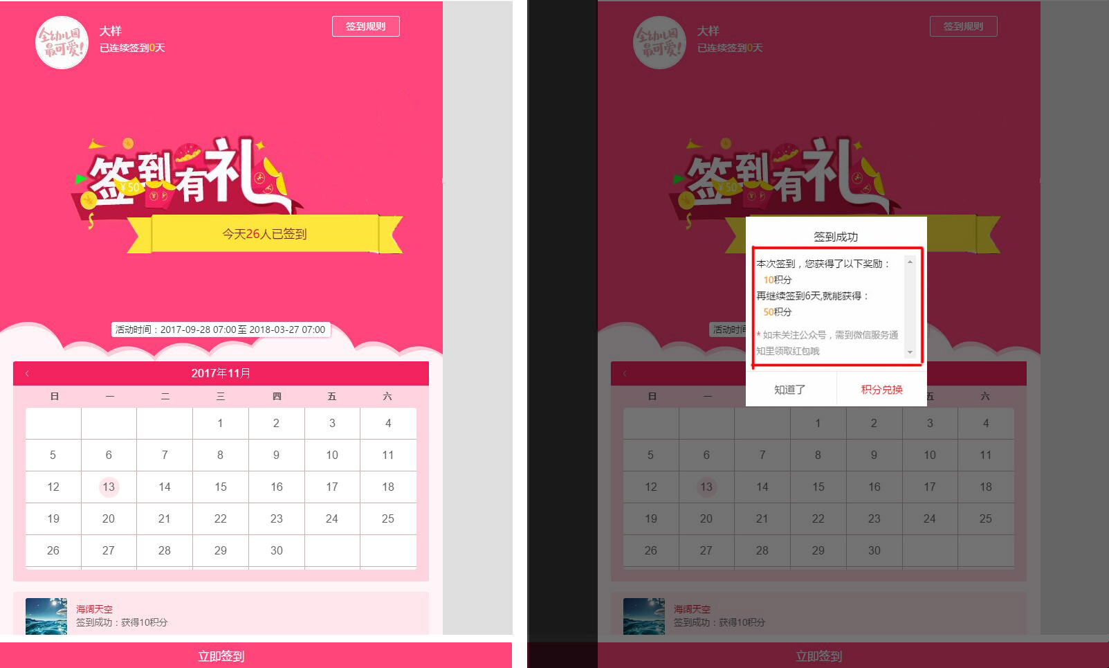 簽到——簽到獲得積分、金幣、購物券、微信紅包,幫助商家提升粉絲留存和購買轉化。