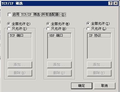 這里我們按照所需要的服務開放響應的端口。在2003系統里,不推薦用TCP/IP篩選里的端口過濾功能,譬如在使用FTP服務器的時候,如果僅僅只開放21端口,由于FTP協議的特殊性,在進行FTP傳輸的時候,由于FTP 特有的Port模式和Passive模式,在進行數據傳輸的時候,需要動態的打開高端口,所以在使用TCP/IP過濾的情況下,經常會出現連接上后無法列出目錄和數據傳輸的問題。所以在2003系統上增加的windows連接防火墻能很好的解決這個問題,所以都不推薦使用網卡的TCP/IP過濾功能。