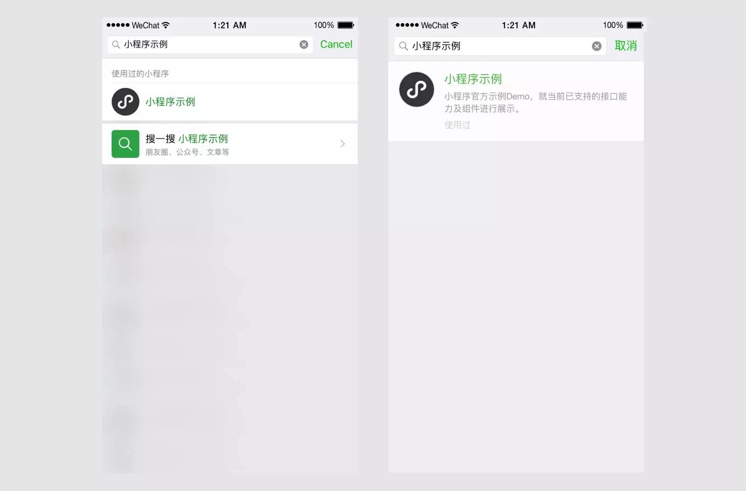 小程序的第二入口是搜索,在“微信”和“通訊錄”兩個一級菜單的頂部都有搜索框,根據規則,只有用戶輸入小程序的全稱時才能在搜索結果里展示小程序(騰訊自家產品和入股的產品除外),并不支持模糊查詢??上攵?,通過這種方式查找到的小程序,其必然只有以下兩類:
