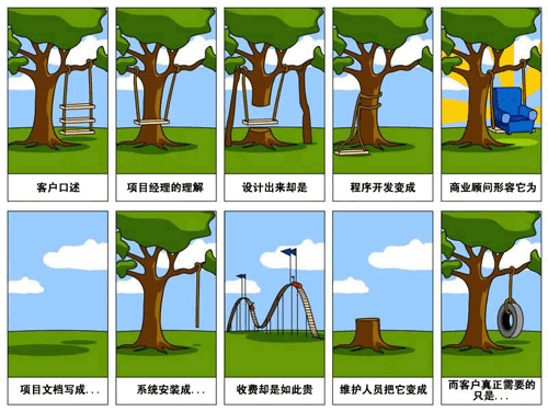 這張圖片說明的意思是:每個人都會站在自己的角度根據(jù)自己的經(jīng)驗(yàn)思考問題。要緊跟用戶的需求,做好需求分析,做好過程管理,以客戶為導(dǎo)向!