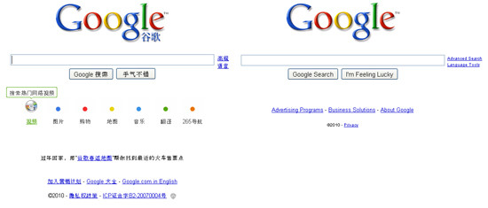 Google 以簡潔著稱,但比較一下 Google China 和 Google US 就能看多一些細微的差別: