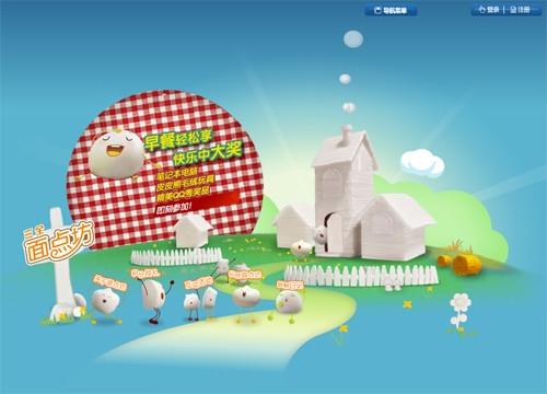 Mian Dian Fang, 一家即食早餐公司,其公司網站也大量使用 Flash。動畫中,饅頭包子一起做早操,以顯示該公司的健康食品理念。