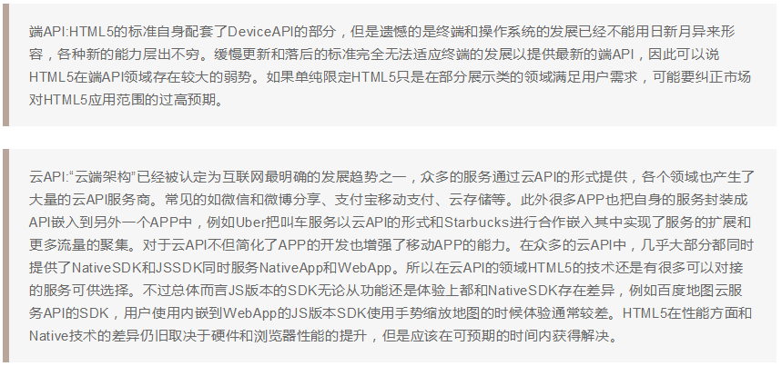 端API:HTML5的標準自身配套了DeviceAPI的部分,但是遺憾的是終端和操作系統的發展已經不能用日新月異來形容,各種新的能力層出不窮。緩慢更新和落后的標準完全無法適應終端的發展以提供最新的端API,因此可以說HTML5在端API領域存在較大的弱勢。如果單純限定HTML5只是在部分展示類的領域滿足用戶需求,可能要糾正市場對HTML5應用范圍的過高預期。