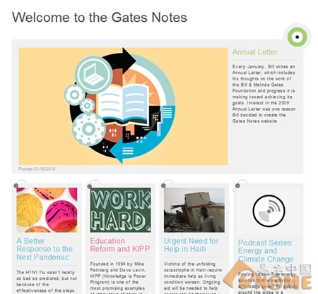 據了解,早在比爾·蓋茨還在微軟掌舵時,就曾發布過內部備忘錄,為公司在互聯網時代面臨的激進轉變制定了路線。 現在,蓋茨準備將他的所思所想發布到新設的網站Gates Notes上。這位比爾&美琳達蓋茨基金會主席,已經開始公布他對H1N1疫情、暢銷書《超級怪異經濟學》等話題的看法。