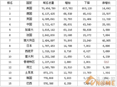 當然,中國仍排在第四的位置,其域名注冊總量比2月的3,710,140,增長了11,277。不僅域名總量增加了,而且凈增長也從2月15的負增長到現在的正增長??傮w來說,域名總量比2月樂觀。在去年同期還落后于加拿大,中國自從“掃黃打非”專項治理到現在,CN域名的大幅度下降,也一定程度上制約著域名的增長。